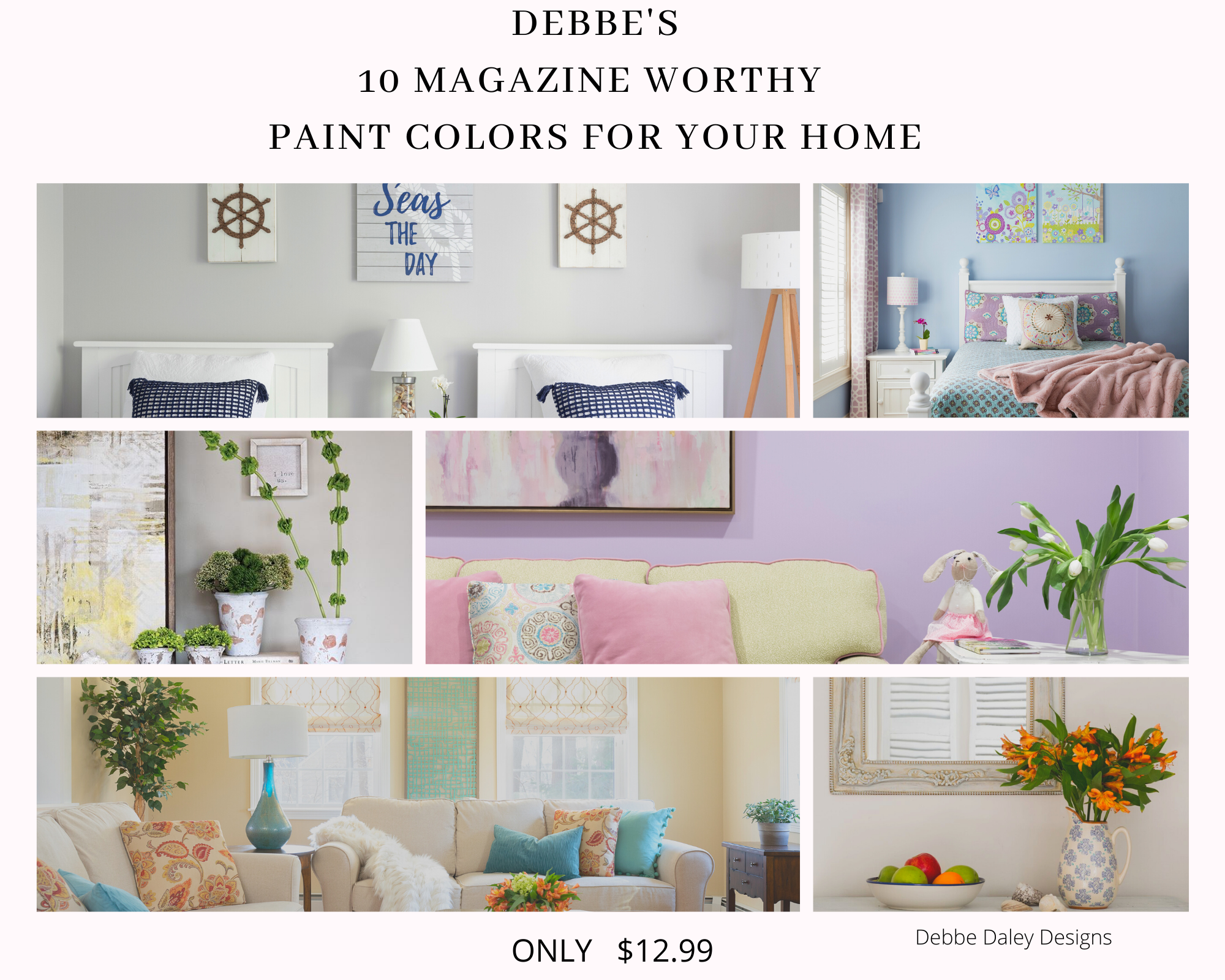 With this 10 page color guide and paint color listing, these professionally designed rooms will not only inspire your paint color pallet, but also provide visuals on color accessoring ideas.